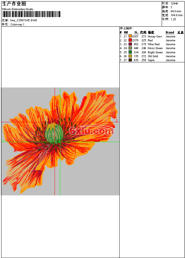 大黄花 花版参数: 大小:131.00 KB / 尺寸:105*94[毫米] / 针数:12941针 / 线色:8 / 格式:emb / 版本:wilcom e2 版带文件需绣花软件方可打开,可配色打印导出各种格式或直接上机绣。如无绣花软件可下载1:1模拟效果图。 图片信息:大小:207.73 kb 397 x 356(像素) emb下载 1:1图下载 关闭 花样推荐 玫瑰花 大红花 玫瑰花 小花 大花 大红花 简单花 大红花 靓花 靓花 上一个花样:花朵 下一个花样:玫瑰花