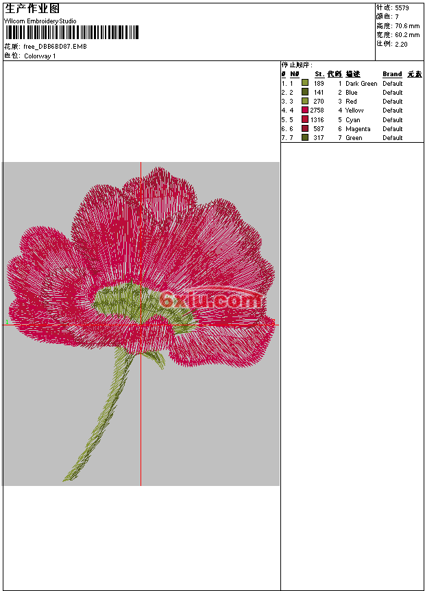 大红花 花版参数: 大小:84.00 KB / 尺寸:60*71[毫米] / 针数:5579针 / 线色:7 / 格式:emb / 版本:wilcom e2 版带文件需绣花软件方可打开,可配色打印导出各种格式或直接上机绣。如无绣花软件可下载1:1模拟效果图。 图片信息:大小:75.78 kb 228 x 268(像素) emb下载 1:1图下载 关闭 花样推荐 花朵 靓花 花朵 大黄花 玫瑰花 大红花 玫瑰花 小花 大花 大红花 上一个花样:靓花 下一个花样:花朵