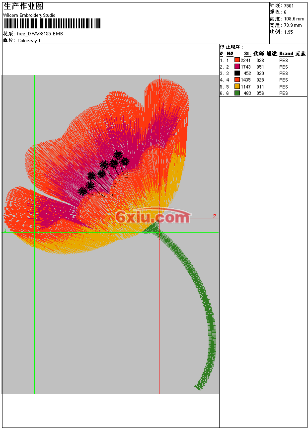 靓花 花版参数: 大小:69.00 KB / 尺寸:74*109[毫米] / 针数:7501针 / 线色:6 / 格式:emb / 版本:wilcom e2 版带文件需绣花软件方可打开,可配色打印导出各种格式或直接上机绣。如无绣花软件可下载1:1模拟效果图。 图片信息:大小:102.24 kb 280 x 411(像素) emb下载 1:1图下载 关闭 花样推荐 大红花 花朵 靓花 花朵 大黄花 玫瑰花 大红花 玫瑰花 小花 大花 上一个花样:靓花 free dst转存的emb 下一个花样:大红花