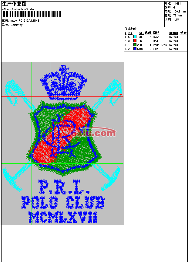 polo 保罗 花版参数: 大小:108.00 KB / 尺寸:76*101[毫米] / 针数:11463针 / 线色:4 / 格式:emb / 版本:wilcom e2 版带文件需绣花软件方可打开,可配色打印导出各种格式或直接上机绣。如无绣花软件可下载1:1模拟效果图。 图片信息:大小:126.35 kb 289 x 382(像素) emb下载 1:1图下载 关闭 花样推荐 鹰标 皇冠 小熊 猫和老鼠 大嘴logo free 章仔 棒球员 polo burberry 熊 贴布 free 吉普车 logo free 上一个花样:卡通 公交车 free 贴布 下一个花样:鹰标