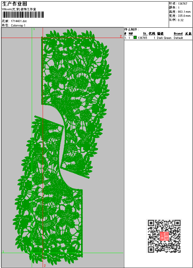 - dst花版参数: 大小:401.18 KB / 尺寸:335*803[毫米] / 针数:136767针 / 线色:1 / 格式:dst / 版本:6