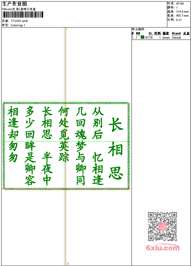 长相思诗词字画工艺精品 点此上传花版兑乐绣币/现金 emb花版参数: 大小:129.50 KB / 尺寸:456*315[毫米] / 针数:47180针 / 线色:1 / 格式:emb / 版本:7 版带文件需绣花软件方可打开,可配色打印导出各种格式或直接上机绣。如无绣花软件可下载1:1模拟效果图。 PNG图片信息:大小:0.7 (MB) /图宽*高:1724x1192(像素) 上传作者( 雷人*** ) 获得乐绣币:30个 emb下载 1:1图下载 关闭 相似花型推荐: 张国老骑驴工艺精品 鸳鸯工艺精品 新疆维吾尔民族花帽 3 新疆维吾尔民族花帽 2 新疆维吾尔民族花帽 十字绣玫瑰花 海豚章仔 荣华工艺精品 梅兰竹菊-国画菊工艺精品 蝴蝶 蝴蝶 老虎头 宁静致远-字画工艺版 花好月圆牡丹花 富贵荣华牡丹花 上一个花样:海狸章仔 下一个花样:张国老骑驴工艺精品