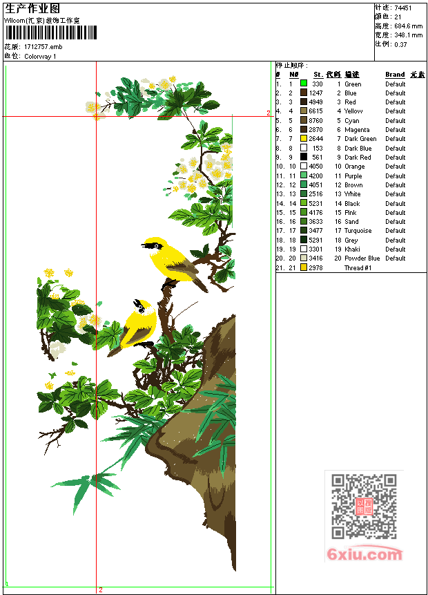 中堂画春夏秋冬-秋工艺精品-竹鸟 点此上传花版兑乐绣币/现金 emb花版参数: 大小:409.00 KB / 尺寸:348*685[毫米] / 针数:74451针 / 线色:21 / 格式:emb / 版本:9 版带文件需绣花软件方可打开,可配色打印导出各种格式或直接上机绣。如无绣花软件可下载1:1模拟效果图。 PNG图片信息:大小:2.2 (MB) /图宽*高:1317x2590(像素) 上传作者( 雷人*** ) 获得乐绣币:30个 emb下载 1:1图下载 关闭 相似花型推荐: 中堂梅兰竹菊--兰工艺精品 梅兰竹菊-兰工艺精品 中国传统吉祥图工艺精品 鸳鸯戏水工艺精品 前幅满幅镂空抽象 鸟叔-毛巾绣 团团圆圆熊猫精品工艺版 满幅背心馬甲珠片 富贵荣华工艺精品 荷花蜻蜓工艺精品 山水杜鹃图工艺精品 迎客松工艺精品 卧虎工艺精品 两只老虎工艺精品 花开富贵工艺精品 上一个花样:中堂画春夏秋冬-夏工艺精品-孔雀 下一个花样:中堂梅兰竹菊--兰工艺精品