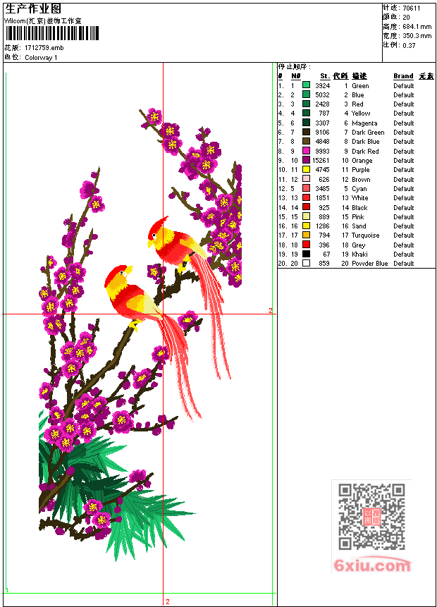 中堂画春夏秋冬春工艺精品—梅花鸟 点此上传花版兑乐绣币/现金 emb花版参数: 大小:383.00 KB / 尺寸:350*684[毫米] / 针数:70611针 / 线色:20 / 格式:emb / 版本:9 版带文件需绣花软件方可打开,可配色打印导出各种格式或直接上机绣。如无绣花软件可下载1:1模拟效果图。 PNG图片信息:大小:2.0 (MB) /图宽*高:1325x2588(像素) 上传作者( 雷人*** ) 获得乐绣币:30个 emb下载 1:1图下载 关闭 相似花型推荐: 中堂画春夏秋冬-夏工艺精品-孔雀 中堂画春夏秋冬-秋工艺精品-竹鸟 中堂梅兰竹菊--兰工艺精品 梅兰竹菊-兰工艺精品 中国传统吉祥图工艺精品 鸳鸯戏水工艺精品 前幅满幅镂空抽象 鸟叔-毛巾绣 团团圆圆熊猫精品工艺版 满幅背心馬甲珠片 富贵荣华工艺精品 荷花蜻蜓工艺精品 山水杜鹃图工艺精品 迎客松工艺精品 卧虎工艺精品 上一个花样:狗-斗牛犬 下一个花样:中堂画春夏秋冬-夏工艺精品-孔雀