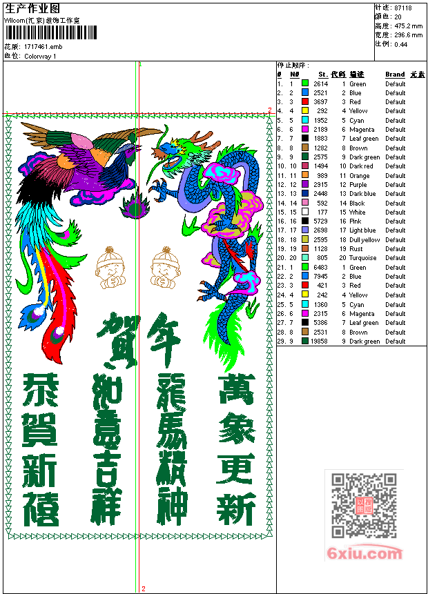 龙凤吉祥工艺精品 点此上传花版兑乐绣币/现金 emb花版参数: 大小:292.50 KB / 尺寸:297*475[毫米] / 针数:87118针 / 线色:20 / 格式:emb / 版本:7 版带文件需绣花软件方可打开,可配色打印导出各种格式或直接上机绣。如无绣花软件可下载1:1模拟效果图。 PNG图片信息:大小:1.8 (MB) /图宽*高:1122x1798(像素) 上传作者( 雷人*** ) 获得乐绣币:30个 emb下载 1:1图下载 关闭 相似花型推荐: 百鹤图工艺精品 神话八仙传说人物-李铁拐工艺精品 凤凰 花开富贵 雄师 羊 水溶绣-鱼 米奇 领花十字绣 飞虎队标志 心形 卡通猴子 红牛RED BULL 窗帘花 龙工艺精品 上一个花样:龙凤报喜工艺精品 下一个花样:百鹤图工艺精品