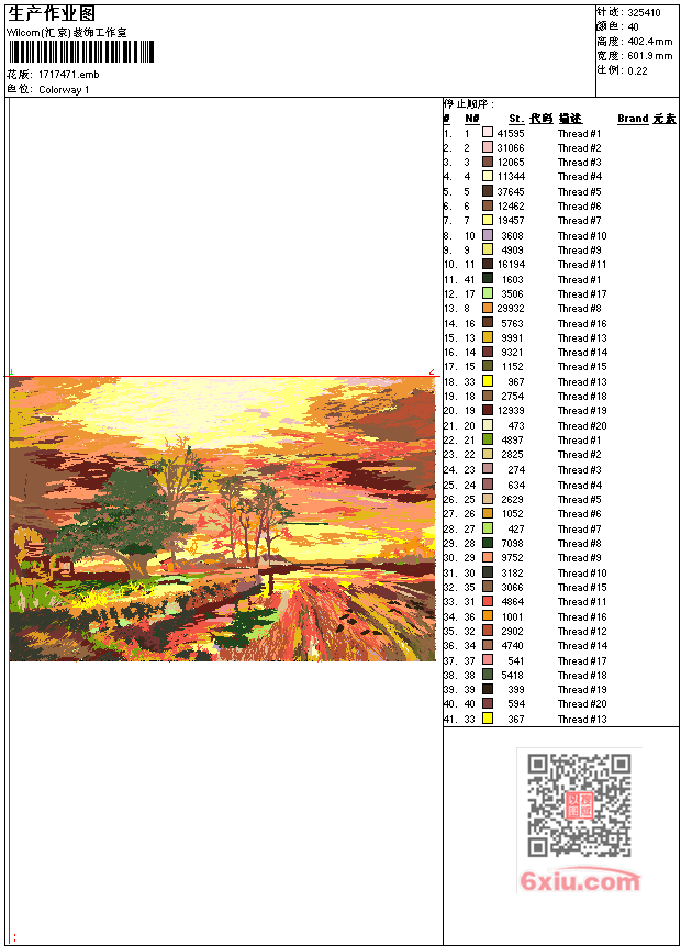 燃烧的天空完工艺精品 点此上传花版兑乐绣币/现金 emb花版参数: 大小:2.04 MB / 尺寸:602*402[毫米] / 针数:325410针 / 线色:40 / 格式:emb / 版本:7 版带文件需绣花软件方可打开,可配色打印导出各种格式或直接上机绣。如无绣花软件可下载1:1模拟效果图。 PNG图片信息:大小:7.7 (MB) /图宽*高:2277x1523(像素) 上传作者( 雷人*** ) 获得乐绣币:30个 emb下载 1:1图下载 关闭 相似花型推荐: 青山绿水大好河山瀑布乱针绣工艺精品 黄果树瀑布乱针绣工艺精品 苍鹰劲松图工艺精品 喜雀报春工艺精品 井冈红叶工艺精品 龙凤报喜工艺精品 龙凤吉祥工艺精品 百鹤图工艺精品 神话八仙传说人物-李铁拐工艺精品 凤凰 花开富贵 雄师 羊 水溶绣-鱼 米奇 上一个花样:牡丹盛开的花工艺精品 下一个花样:青山绿水大好河山瀑布乱针绣工艺精品