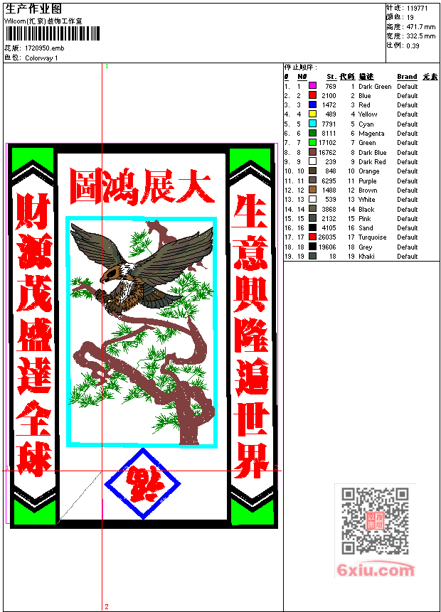鹰-大展鸿图工艺精品 点此上传花版兑乐绣币/现金 emb花版参数: 大小:290.00 KB / 尺寸:333*472[毫米] / 针数:119771针 / 线色:19 / 格式:emb / 版本:7 版带文件需绣花软件方可打开,可配色打印导出各种格式或直接上机绣。如无绣花软件可下载1:1模拟效果图。 PNG图片信息:大小:2.1 (MB) /图宽*高:1258x1785(像素) 上传作者( 雷人*** ) 获得乐绣币:30个 emb下载 1:1图下载 关闭 相似花型推荐: 梅花-春意透南枝工艺精品 花 茶字工艺精品 孔雀-用在家纺上 海马 轮船章仔 船舵 鬼脸 旗赛车 鹰章仔枪 章仔手枪 豹动物 花盆 虎动物 船 上一个花样:雁南飞工艺精品 下一个花样:梅花-春意透南枝工艺精品