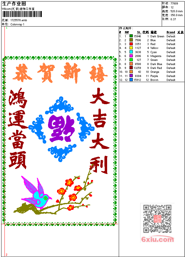 恭贺新禧-喜鹊工艺精品 点此上传花版兑乐绣币/现金 emb花版参数: 大小:275.00 KB / 尺寸:350*520[毫米] / 针数:77838针 / 线色:12 / 格式:emb / 版本:7 版带文件需绣花软件方可打开,可配色打印导出各种格式或直接上机绣。如无绣花软件可下载1:1模拟效果图。 PNG图片信息:大小:1.5 (MB) /图宽*高:1324x1967(像素) 上传作者( 雷人*** ) 获得乐绣币:30个 emb下载 1:1图下载 关闭 相似花型推荐: 赤壁怀古字画诗-工艺精品 雕孔上衣条码摆 凤凰 凤凰 小金龙工艺精品 五子图工艺精品 印度泰姬陵工艺精品 水乡风景工艺精品 双龙戏珠工艺精品 小天使毛巾珠片绣工艺精品 毛巾绣熊猫工艺精品 毛巾小狗工艺精品 嬉戏猫咪-乱针绣工艺精品 美女工艺精品 茅草屋小桥流水-工艺精品 上一个花样:凤凰工艺精品 下一个花样:赤壁怀古字画诗-工艺精品