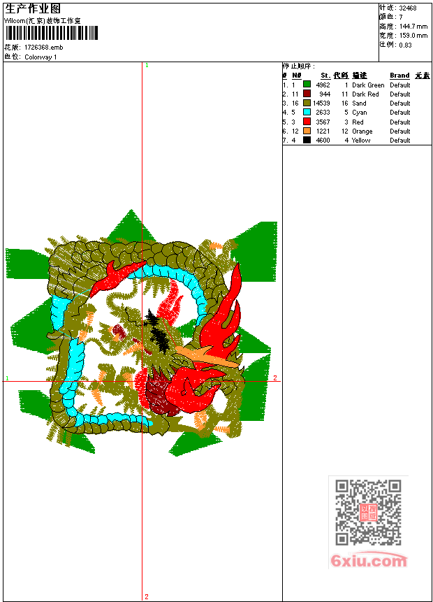 龙工艺精品 点此上传花版兑乐绣币/现金 emb花版参数: 大小:184.00 KB / 尺寸:159*145[毫米] / 针数:32468针 / 线色:7 / 格式:emb / 版本:7 版带文件需绣花软件方可打开,可配色打印导出各种格式或直接上机绣。如无绣花软件可下载1:1模拟效果图。 PNG图片信息:大小:0.5 (MB) /图宽*高:602x548(像素) 上传作者( 雷人*** ) 获得乐绣币:30个 emb下载 1:1图下载 关闭 相似花型推荐: 凤凰工艺精品 蝴蝶飞呀-精品花 繁花似锦-戏服裙摆 花样百出 牡丹花 摩托车赛车-精品 章标 卡车 国旗 鹰章 天鹅鸟 章标 飞机标 鱼 武士帽 上一个花样:兔卡通 下一个花样:凤凰工艺精品