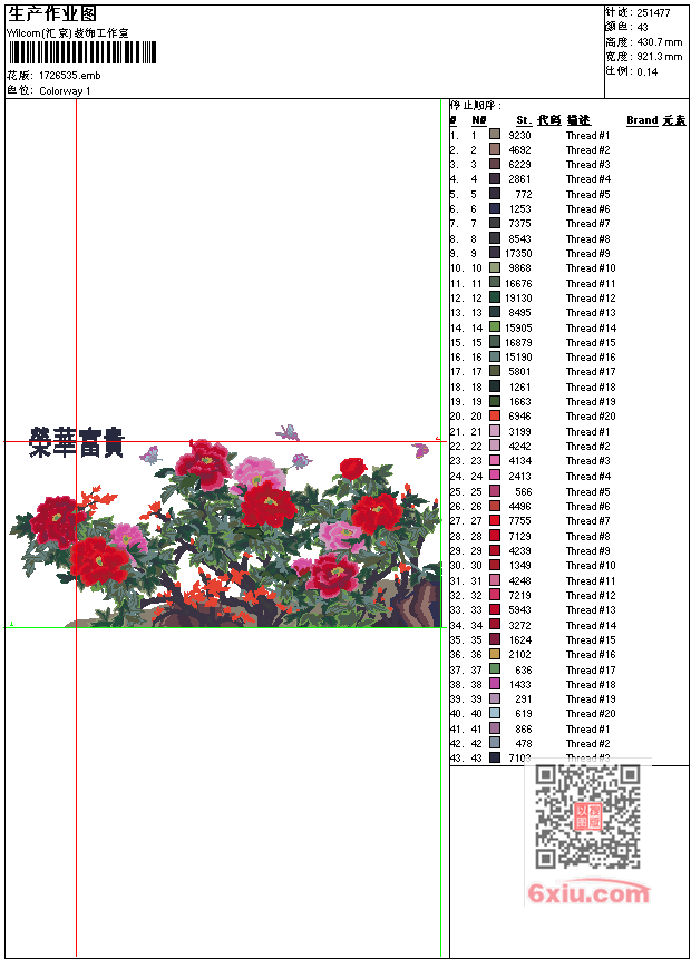荣华富贵工艺精品-牡丹花 点此上传花版兑乐绣币/现金 emb花版参数: 大小:1.20 MB / 尺寸:921*431[毫米] / 针数:251477针 / 线色:43 / 格式:emb / 版本:7 版带文件需绣花软件方可打开,可配色打印导出各种格式或直接上机绣。如无绣花软件可下载1:1模拟效果图。 PNG图片信息:大小:7.5 (MB) /图宽*高:3485x1630(像素) 上传作者( 雷人*** ) 获得乐绣币:30个 emb下载 1:1图下载 关闭 相似花型推荐: 牡丹花-荣华富贵工艺精品 牡丹 富贵荣华牡丹花工艺精品 靓花 猴子摘桃 武士头 球队标 武士头 骷髅赛手 骷髅赛手 武士头 足球 男孩卡通 豹 章标 骷髅标 狗章 上一个花样:鸳鸯戏水工艺精品-荷花莲花 下一个花样:牡丹花-荣华富贵工艺精品