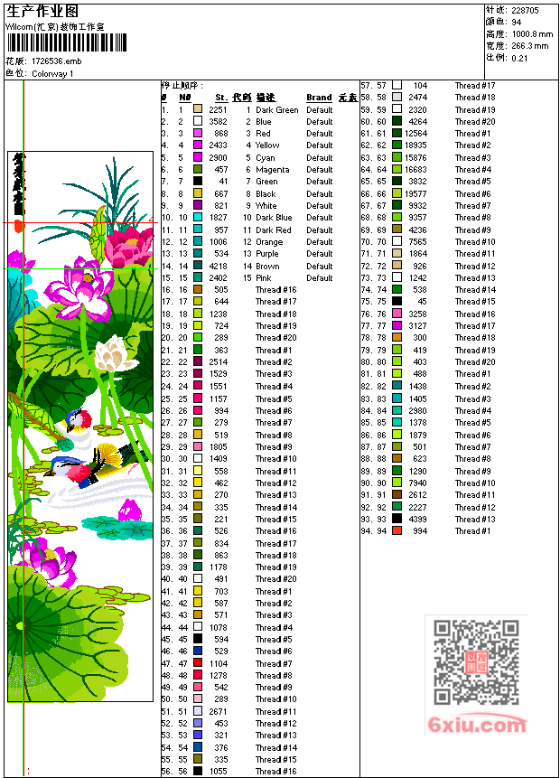 鸳鸯戏水工艺精品-荷花莲花 点此上传花版兑乐绣币/现金 emb花版参数: 大小:1.02 MB / 尺寸:266*1001[毫米] / 针数:228705针 / 线色:94 / 格式:emb / 版本:7 版带文件需绣花软件方可打开,可配色打印导出各种格式或直接上机绣。如无绣花软件可下载1:1模拟效果图。 PNG图片信息:大小:5.7 (MB) /图宽*高:1008x3786(像素) 上传作者( 雷人*** ) 获得乐绣币:30个 emb下载 1:1图下载 关闭 相似花型推荐: 荣华富贵工艺精品-牡丹花 牡丹花-荣华富贵工艺精品 牡丹 富贵荣华牡丹花工艺精品 靓花 猴子摘桃 武士头 球队标 武士头 骷髅赛手 骷髅赛手 武士头 足球 男孩卡通 豹 章标 骷髅标 上一个花样:红梅迎春-工艺精品镜画 下一个花样:荣华富贵工艺精品-牡丹花