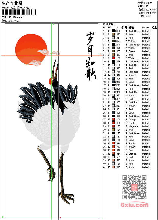 鹤工艺精品-岁月如歌 点此上传花版兑乐绣币/现金 emb花版参数: 大小:346.50 KB / 尺寸:241*502[毫米] / 针数:55299针 / 线色:19 / 格式:emb / 版本:7 版带文件需绣花软件方可打开,可配色打印导出各种格式或直接上机绣。如无绣花软件可下载1:1模拟效果图。 PNG图片信息:大小:1.1 (MB) /图宽*高:912x1899(像素) 上传作者( 雷人*** ) 获得乐绣币:30个 emb下载 1:1图下载 关闭 相似花型推荐: 荷花-莲花-工艺精品 豹 鹰 鹰头狮身 狗狗 骑扫帚的巫师 外国警察章标 帆船 狮子头 中国风山水 家纺 精品 工艺品 家纺 条子 精品 凤凰 牡丹花 贴布 工艺 永结同心 女孩 家纺新花型-花朵 凤凰 上一个花样:莲花工艺精品-佛 下一个花样:荷花-莲花-工艺精品