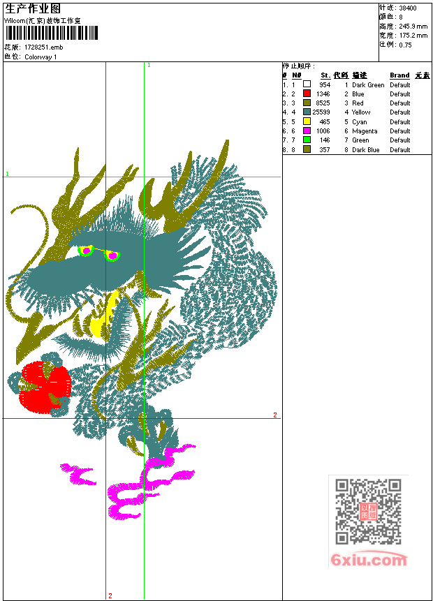 龙工艺精品 点此上传花版兑乐绣币/现金 emb花版参数: 大小:186.50 KB / 尺寸:175*246[毫米] / 针数:38400针 / 线色:8 / 格式:emb / 版本:7 版带文件需绣花软件方可打开,可配色打印导出各种格式或直接上机绣。如无绣花软件可下载1:1模拟效果图。 PNG图片信息:大小:0.7 (MB) /图宽*高:663x931(像素) 上传作者( 雷人*** ) 获得乐绣币:30个 emb下载 1:1图下载 关闭 相似花型推荐: 龙工艺精品 龙工艺精品 花卉 花条 鞋 熊-小熊 人物 天女散花 仙女 精品工艺品 美女 家纺 雪女王主枕头 曲线 水溶花匹绣 象 大象 民族 人物 卡通 仁龍 仁龙 虎 -老虎 狼头 豹子 龙 凤凰 1尺3四角观音佛祖令旗 凤凰-3尺2双凤牡丹桌围 凤凰 1尺5祈求吉庆 上一个花样:花朵 家纺 大花 双喜 被花 下一个花样:龙工艺精品