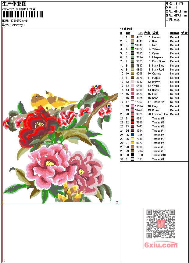 鸟-牡丹花图工艺精品 点此上传花版兑乐绣币/现金 emb花版参数: 大小:863.50 KB / 尺寸:485*499[毫米] / 针数:193179针 / 线色:31 / 格式:emb / 版本:7 版带文件需绣花软件方可打开,可配色打印导出各种格式或直接上机绣。如无绣花软件可下载1:1模拟效果图。 PNG图片信息:大小:4.8 (MB) /图宽*高:1835x1887(像素) 上传作者( 雷人*** ) 获得乐绣币:60个 emb下载 1:1图下载 关闭 相似花型推荐: 荷花-蜻蜓-工艺精品 荷花-蜻蜓-工艺精品 鹿-小鹿-童装卡通-珠片 鹰-老鹰-鸟-珠片 鸟-珠片 龙风喜工艺精品 龙飞凤舞工艺精品 风景-柳树湾工艺精品 佛-莲花佛工艺精品 鹰-老鹰工艺精品-鸟 狼头工艺精品 花-蝴蝶-中国风 马-珠片-亮片五色马 风景-江南水乡工艺精品-桥-船 虎-老虎工艺精品 上一个花样:菊花螳螂工艺精品 下一个花样:荷花-蜻蜓-工艺精品