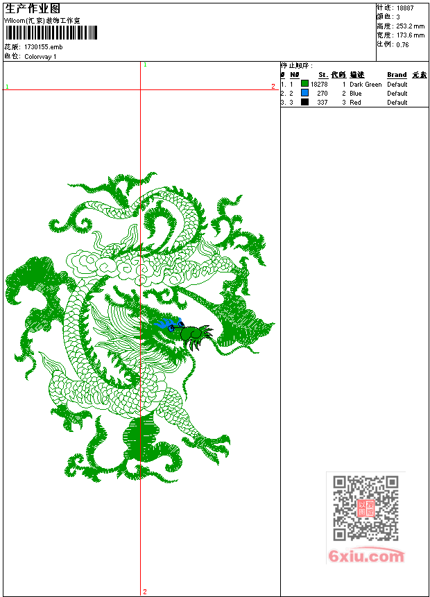 龙工艺精品 点此上传花版兑乐绣币/现金 emb花版参数: 大小:94.50 KB / 尺寸:174*253[毫米] / 针数:18888针 / 线色:3 / 格式:emb / 版本:7 版带文件需绣花软件方可打开,可配色打印导出各种格式或直接上机绣。如无绣花软件可下载1:1模拟效果图。 PNG图片信息:大小:0.5 (MB) /图宽*高:657x958(像素) 上传作者( 雷人*** ) 获得乐绣币:30个 emb下载 1:1图下载 关闭 相似花型推荐: 龙工艺精品 鹤送福工艺精品 人物 敦煌佛像工艺精品 鸟花-春夏秋冬工艺精品 鹰 大展鸿图雄鹰展翅工艺精品 水果-菠萝工艺精品 人物 八仙 荣华富贵工艺精品 花 春夏秋冬-秋工艺精品 牡丹花 荣华工艺精品 牡丹花-花瓶工艺精品 鸳鸯戏水工艺精品 鸳鸯戏水工艺精品 字画友情工艺精品 人物 埃及法老工艺精品 羊工艺精品 上一个花样:鹰 奋斗 字画 铭志工艺精品 下一个花样:龙工艺精品