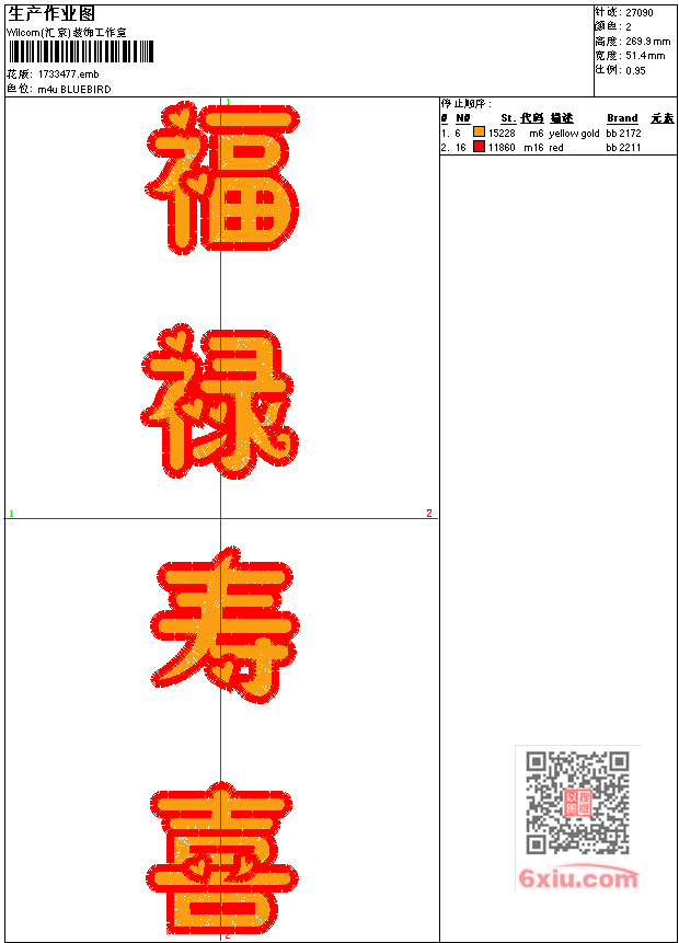 字 福寿禄喜工艺精品 点此上传花版兑乐绣币/现金 emb花版参数: 大小:111.00 KB / 尺寸:51*270[毫米] / 针数:27090针 / 线色:2 / 格式:emb / 版本:7 版带文件需绣花软件方可打开,可配色打印导出各种格式或直接上机绣。如无绣花软件可下载1:1模拟效果图。 PNG图片信息:大小:0.2 (MB) /图宽*高:195x1021(像素) 上传作者( 雷人*** ) 获得乐绣币:30个 emb下载 1:1图下载 关闭 相似花型推荐: 龙 凤凰 福寿安康吉祥工艺精品 凤凰工艺精品 牡丹花-中国风传统 人物-海盗 章仔 男装 领-喇叭花 龙-古典 花-单朵彼岸花 花 彼岸花三支 曲线 复古图案 蝴蝶 龙凤图-凤凰衣吉祥传统戏服 猴子 卡通 动物 猩猩 花草-大花 家纺 花草 鸟 鞋面 孔雀 工艺精品 上一个花样:卡通 动漫 人物 犬夜叉工艺精品 下一个花样:龙 凤凰 福寿安康吉祥工艺精品