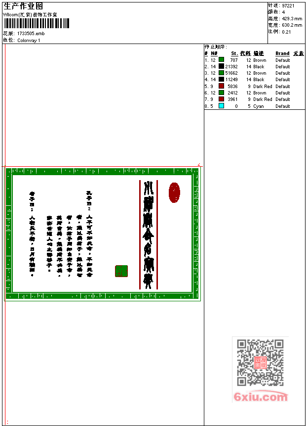 孔子字画工艺精品 点此上传花版兑乐绣币/现金 emb花版参数: 大小:200.00 KB / 尺寸:630*429[毫米] / 针数:97221针 / 线色:4 / 格式:emb / 版本:7 版带文件需绣花软件方可打开,可配色打印导出各种格式或直接上机绣。如无绣花软件可下载1:1模拟效果图。 PNG图片信息:大小:1.5 (MB) /图宽*高:2384x1624(像素) 上传作者( 雷人*** ) 获得乐绣币:30个 emb下载 1:1图下载 关闭 相似花型推荐: 孔雀开屏工艺精品 孔雀工艺精品 家和万事兴图案工艺精品 大花朵工艺精品 盆景花工艺 虎啸工艺精品 福 万事如意工艺精品 腾飞的龙工艺精品 风景 唐伯虎山水画工艺精品 四君子梅兰竹菊兰工艺精品 凤凰 雙鳳工艺精品 寿字工艺精品 时钟 鸟 工艺精品 树 狗 十二生肖之狗 艺精品 上一个花样:老虎工艺精品 下一个花样:孔雀开屏工艺精品