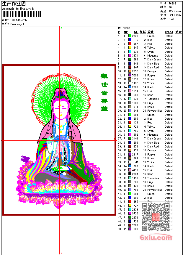 观世音菩萨佛 工艺精品 点此上传花版兑乐绣币/现金 emb花版参数: 大小:282.50 KB / 尺寸:322*428[毫米] / 针数:76388针 / 线色:20 / 格式:emb / 版本:7 版带文件需绣花软件方可打开,可配色打印导出各种格式或直接上机绣。如无绣花软件可下载1:1模拟效果图。 PNG图片信息:大小:1.8 (MB) /图宽*高:1218x1618(像素) 上传作者( 雷人*** ) 获得乐绣币:30个 emb下载 1:1图下载 关闭 相似花型推荐: 恭喜发财工艺精品 龙 恭贺新喜工艺精品 福 恭贺新禧工艺精品 鸳鸯工艺精品 松鹤长春工艺精品 鹤 瀑布 人间仙境工艺精品 鸟 老鹰工艺精品 鸟 老鹰工艺精品 老虎工艺精品 孔子字画工艺精品 孔雀开屏工艺精品 孔雀工艺精品 家和万事兴图案工艺精品 大花朵工艺精品 盆景花工艺 上一个花样:观音 佛 工艺精品 下一个花样:恭喜发财工艺精品