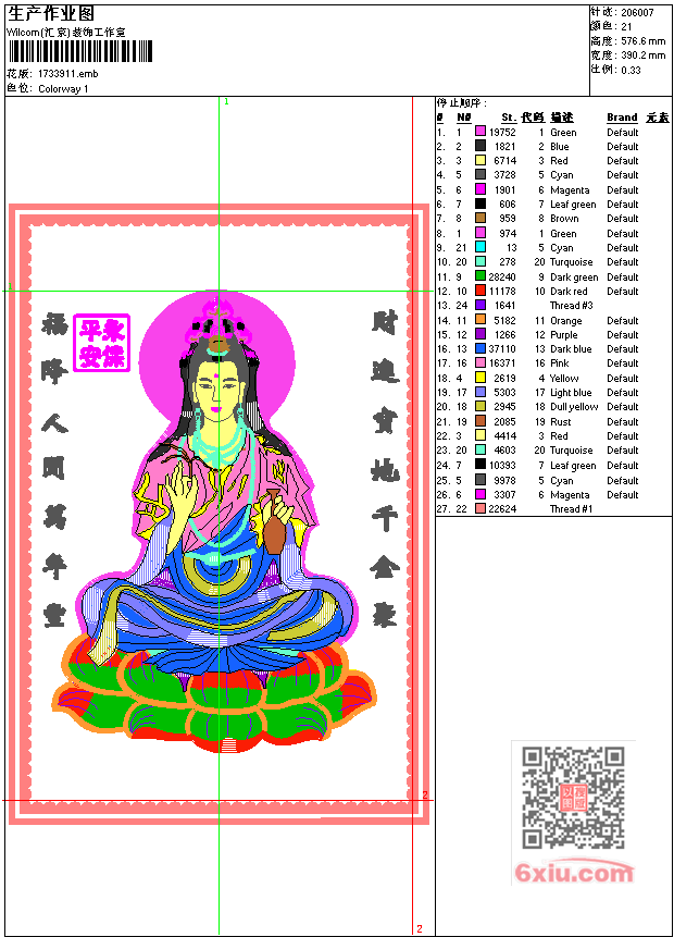 观音坐莲工艺精品 点此上传花版兑乐绣币/现金 emb花版参数: 大小:528.00 KB / 尺寸:390*577[毫米] / 针数:206007针 / 线色:21 / 格式:emb / 版本:9 版带文件需绣花软件方可打开,可配色打印导出各种格式或直接上机绣。如无绣花软件可下载1:1模拟效果图。 PNG图片信息:大小:3.4 (MB) /图宽*高:1477x2182(像素) 上传作者( 雷人*** ) 获得乐绣币:30个 emb下载 1:1图下载 关闭 相似花型推荐: 观音菩萨工艺精品 民族少女 古老的花园工艺精品 刘德华 人物 孤男寡女乱针绣工艺精品 恭喜发财之米奇毛巾绣工艺精品 福 鲤鱼 恭贺新禧工艺精品 牡丹花 鲤鱼 富贵有余工艺精品 富贵牡丹花工艺精品 牡丹花 锦鸟 富贵吉祥图工艺精品 福十字绣 工艺精品 孔雀 大花 枝留工艺精品 凤飞九天工艺精品 凤凰 凤凰 吉祥如意 工艺精品 风景 船 工艺精品 房子圣诞树工艺精品 方福工艺精品 上一个花样:荷花蜻蜓 工艺精品 下一个花样:观音菩萨工艺精品