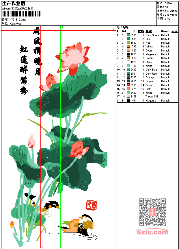 荷花红莲鸳鸯工艺精品 点此上传花版兑乐绣币/现金 emb花版参数: 大小:269.00 KB / 尺寸:235*519[毫米] / 针数:58804针 / 线色:16 / 格式:emb / 版本:9 版带文件需绣花软件方可打开,可配色打印导出各种格式或直接上机绣。如无绣花软件可下载1:1模拟效果图。 PNG图片信息:大小:1.7 (MB) /图宽*高:889x1965(像素) 上传作者( 雷人*** ) 获得乐绣币:30个 emb下载 1:1图下载 关闭 相似花型推荐: 字诗 和气生财工艺精品 荷花图工艺精品 荷花蜻蜓 工艺精品 观音坐莲工艺精品 观音菩萨工艺精品 民族少女 古老的花园工艺精品 刘德华 人物 孤男寡女乱针绣工艺精品 恭喜发财之米奇毛巾绣工艺精品 福 鲤鱼 恭贺新禧工艺精品 牡丹花 鲤鱼 富贵有余工艺精品 富贵牡丹花工艺精品 牡丹花 锦鸟 富贵吉祥图工艺精品 福十字绣 工艺精品 孔雀 大花 枝留工艺精品 凤飞九天工艺精品 凤凰 上一个花样:虎头工艺精品 下一个花样:字诗 和气生财工艺精品
