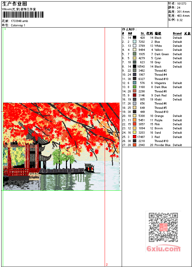 风景 亭台楼阁 平湖秋月乱针绣工艺精品 点此上传花版兑乐绣币/现金 emb花版参数: 大小:401.00 KB / 尺寸:403*301[毫米] / 针数:101373针 / 线色:24 / 格式:emb / 版本:7 版带文件需绣花软件方可打开,可配色打印导出各种格式或直接上机绣。如无绣花软件可下载1:1模拟效果图。 PNG图片信息:大小:3.8 (MB) /图宽*高:1526x1140(像素) 上传作者( 雷人*** ) 获得乐绣币:30个 emb下载 1:1图下载 关闭 相似花型推荐: 牛工艺精品 荷花 鲤鱼 年年有余工艺精品 风景 草屋 农村 牧野风光工艺精品 牡丹图工艺精品 牡丹花工艺精品 猛虎上山工艺精品 猛虎气像-十字绣 工艺精品 人物 头像 美女乱针绣工艺精品 梅兰竹菊-菊工艺精品 梅兰竹菊 鸟 -工笔竹工艺精品 梅花开工艺精品 鸟 玫瑰花工艺精品 红太阳 头像人物 毛泽东主席乱针绣工艺精品 风景 黄金满地 满园春色乱针绣工艺精品 字诗 满江红工艺精品 上一个花样:风景 热带雨林乱针绣工艺精品 下一个花样:牛工艺精品