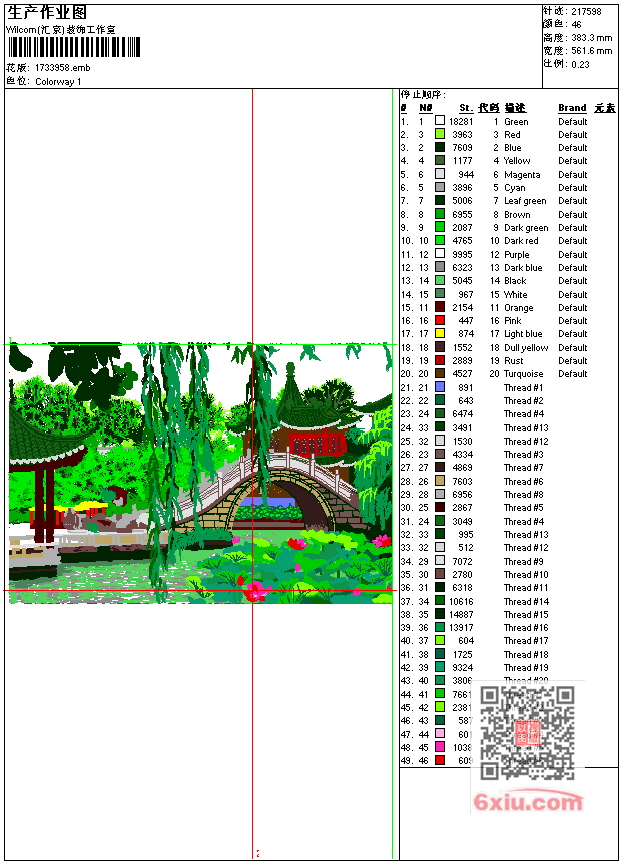 风景 亭台楼阁 四季画乱针绣工艺精品 点此上传花版兑乐绣币/现金 emb花版参数: 大小:964.50 KB / 尺寸:562*383[毫米] / 针数:217598针 / 线色:46 / 格式:emb / 版本:5.5 版带文件需绣花软件方可打开,可配色打印导出各种格式或直接上机绣。如无绣花软件可下载1:1模拟效果图。 PNG图片信息:大小:6.9 (MB) /图宽*高:2125x1450(像素) 上传作者( 雷人*** ) 获得乐绣币:30个 emb下载 1:1图下载 关闭 相似花型推荐: 人物 四大美女-貂蝉工艺精品 风景 窗 江南 水乡乱针绣工艺精品 双鹿图工艺精品 双龙戏珠乱针绣工艺精品 十字绣家和万事兴工艺精品 十二生肖之蛇工艺精品 牡丹花 荣华工艺精品 风景 热带雨林乱针绣工艺精品 风景 亭台楼阁 平湖秋月乱针绣工艺精品 牛工艺精品 荷花 鲤鱼 年年有余工艺精品 风景 草屋 农村 牧野风光工艺精品 牡丹图工艺精品 牡丹花工艺精品 猛虎上山工艺精品 上一个花样:四神兽之朱雀工艺精品 下一个花样:人物 四大美女-貂蝉工艺精品
