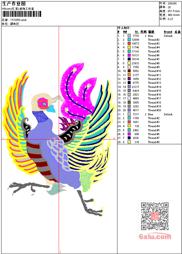 四神兽之朱雀工艺精品 点此上传花版兑乐绣币/现金 emb花版参数: 大小:389.00 KB / 尺寸:480*652[毫米] / 针数:200281针 / 线色:20 / 格式:emb / 版本:9 版带文件需绣花软件方可打开,可配色打印导出各种格式或直接上机绣。如无绣花软件可下载1:1模拟效果图。 PNG图片信息:大小:6.1 (MB) /图宽*高:1818x2465(像素) 上传作者( 雷人*** ) 获得乐绣币:30个 emb下载 1:1图下载 关闭 相似花型推荐: 风景 亭台楼阁 四季画乱针绣工艺精品 人物 四大美女-貂蝉工艺精品 风景 窗 江南 水乡乱针绣工艺精品 双鹿图工艺精品 双龙戏珠乱针绣工艺精品 十字绣家和万事兴工艺精品 十二生肖之蛇工艺精品 牡丹花 荣华工艺精品 风景 热带雨林乱针绣工艺精品 风景 亭台楼阁 平湖秋月乱针绣工艺精品 牛工艺精品 荷花 鲤鱼 年年有余工艺精品 风景 草屋 农村 牧野风光工艺精品 牡丹图工艺精品 牡丹花工艺精品 上一个花样:松鹤长寿工艺精品 下一个花样:风景 亭台楼阁 四季画乱针绣工艺精品
