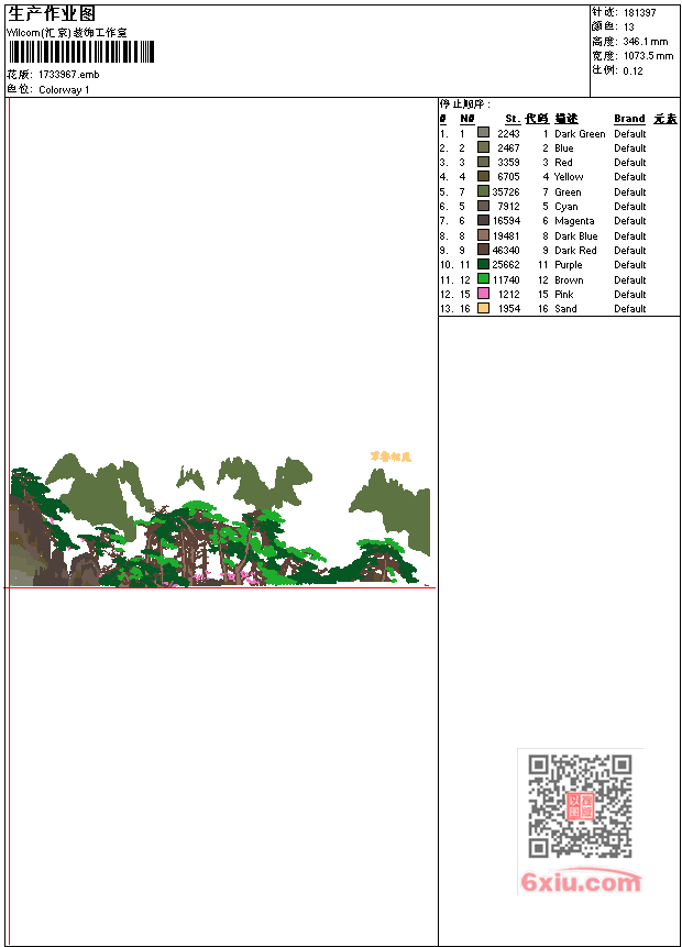 风景 松树 黄山 万壑松风工艺精品 点此上传花版兑乐绣币/现金 emb花版参数: 大小:826.00 KB / 尺寸:1074*346[毫米] / 针数:181397针 / 线色:13 / 格式:emb / 版本:8 版带文件需绣花软件方可打开,可配色打印导出各种格式或直接上机绣。如无绣花软件可下载1:1模拟效果图。 PNG图片信息:大小:5.6 (MB) /图宽*高:4061x1310(像素) 上传作者( 雷人*** ) 获得乐绣币:30个 emb下载 1:1图下载 关闭 相似花型推荐: 风景 田园-乱针工艺精品 风景 水墨中堂画 唐寅名画-独游工艺精品 风景 唐伯虎名画-青山工艺精品 字画 苏轼诗词工艺精品 风景 亭台楼阁 苏州盘门-仁寿亭工艺精品 松齡鹤寿工艺精品 松鹤长寿工艺精品 四神兽之朱雀工艺精品 风景 亭台楼阁 四季画乱针绣工艺精品 人物 四大美女-貂蝉工艺精品 风景 窗 江南 水乡乱针绣工艺精品 双鹿图工艺精品 双龙戏珠乱针绣工艺精品 十字绣家和万事兴工艺精品 十二生肖之蛇工艺精品 上一个花样:梅花 竹 喜鹊 喜上眉梢工艺精品 下一个花样:风景 田园-乱针工艺精品