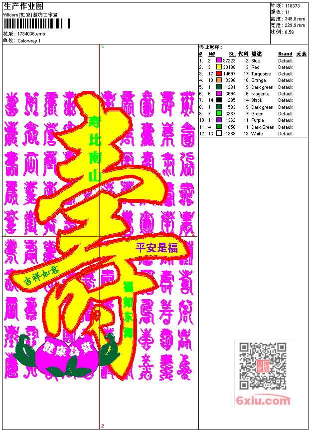字 百寿图工艺精品 点此上传花版兑乐绣币/现金 emb花版参数: 大小:644.50 KB / 尺寸:230*350[毫米] / 针数:118355针 / 线色:11 / 格式:emb / 版本:9 版带文件需绣花软件方可打开,可配色打印导出各种格式或直接上机绣。如无绣花软件可下载1:1模拟效果图。 PNG图片信息:大小:1.7 (MB) /图宽*高:870x1323(像素) 上传作者( 雷人*** ) 获得乐绣币:30个 emb下载 1:1图下载 关闭 相似花型推荐: 人物 百子图工艺精品 梅花 报春图工艺精品 鸟 报喜鸟工艺精品 熊 北极熊工艺精品 人物 财神到 工艺精品 财神工艺精品 生意兴隆 景 长城 沧海腾龙乱针绣工艺精品 锦绣山河 鱼 垂钓工艺精品 牡丹花 春夏秋冬-工艺精品 鸳鸯 春夏秋冬-夏工艺精品 竹子 春夏秋冬-工艺精品 景中堂画 春意盎然工艺精品 牡丹花 靓花 大花工艺精品 鹰 大展宏图工艺精品 龙 单龙戏珠 上一个花样:福 百福图工艺精品 下一个花样:人物 百子图工艺精品