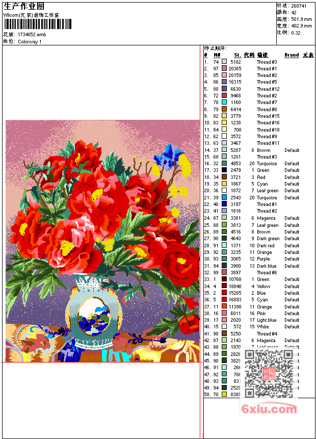 粉底牡丹花瓶乱针绣工艺精品 点此上传花版兑乐绣币/现金 emb花版参数: 大小:1.53 MB / 尺寸:403*502[毫米] / 针数:268741针 / 线色:42 / 格式:emb / 版本:7 版带文件需绣花软件方可打开,可配色打印导出各种格式或直接上机绣。如无绣花软件可下载1:1模拟效果图。 PNG图片信息:大小:6.8 (MB) /图宽*高:1524x1899(像素) 上传作者( 雷人*** ) 获得乐绣币:30个 emb下载 1:1图下载 关闭 相似花型推荐: 鹰 大展宏图工艺精品 景 大山风景乱针绣工艺精品 美女 达瓦卓玛乱针绣工艺精品 荷花 春夏秋冬夏工艺精品 菊花 春夏秋冬秋工艺精品 字画 人物 成功工艺精品 景 屋 城堡工艺精品 人物 财神到 工艺精品 鸟 比翼鸟工艺精品 人物 童话 矮人巫师工艺精品 字 双喜 囍 工艺精品 百年好合 永结同心 人物 阿拉法特乱针绣工艺精品 鹤 爱仙鹤工艺精品 梅 傲梅工艺精品 福 百福图工艺精品 上一个花样:福工艺精品 下一个花样:鹰 大展宏图工艺精品