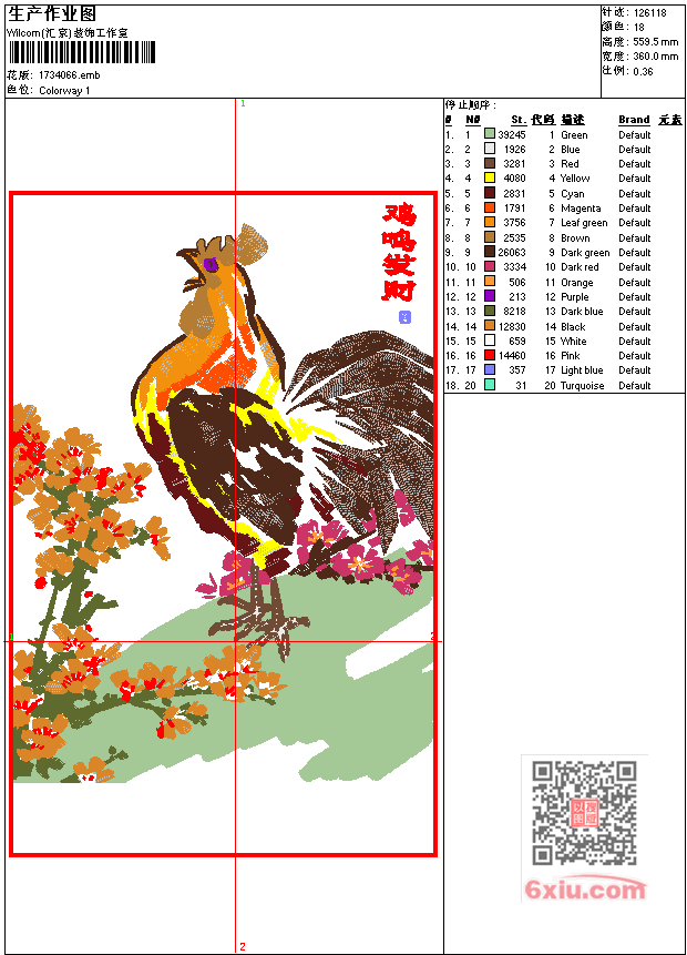 鸡鸣发财工艺精品 点此上传花版兑乐绣币/现金 emb花版参数: 大小:460.50 KB / 尺寸:360*560[毫米] / 针数:126118针 / 线色:18 / 格式:emb / 版本:9 版带文件需绣花软件方可打开,可配色打印导出各种格式或直接上机绣。如无绣花软件可下载1:1模拟效果图。 PNG图片信息:大小:3.5 (MB) /图宽*高:1362x2117(像素) 上传作者( 雷人*** ) 获得乐绣币:30个 emb下载 1:1图下载 关闭 相似花型推荐: 树 黄金大道乱针绣工艺精品 花开富贵工艺精品 牡丹花 鸟 花好月圆工艺精品 花工艺精品 虎-老虎工艺精品 牡丹花 国色天香工艺精品 鸟 国画花鸟工艺精品 神 人物 观音工艺精品 字 恭喜发财工艺精品 景 树 赶集乱针绣工艺精品 牡丹花 富贵荣华工艺精品 福工艺精品 粉底牡丹花瓶乱针绣工艺精品 鹰 大展宏图工艺精品 景 大山风景乱针绣工艺精品 上一个花样:鸟 靓花 锦绣前程工艺精品 下一个花样:树 黄金大道乱针绣工艺精品