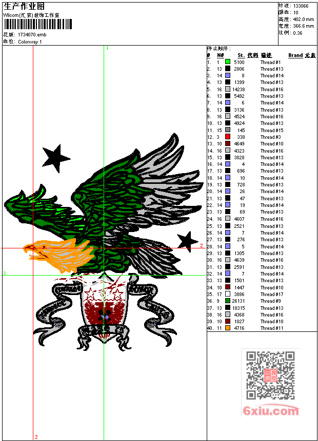 老鹰工艺精品 点此上传花版兑乐绣币/现金 emb花版参数: 大小:471.00 KB / 尺寸:367*402[毫米] / 针数:133066针 / 线色:10 / 格式:emb / 版本:9 版带文件需绣花软件方可打开,可配色打印导出各种格式或直接上机绣。如无绣花软件可下载1:1模拟效果图。 PNG图片信息:大小:2.4 (MB) /图宽*高:1387x1521(像素) 上传作者( 雷人*** ) 获得乐绣币:30个 emb下载 1:1图下载 关闭 相似花型推荐: 孔雀开屏工艺精品 人物 敬爱的周总理乱针绣工艺精品 鸟 靓花 锦绣前程工艺精品 鸡鸣发财工艺精品 树 黄金大道乱针绣工艺精品 花开富贵工艺精品 牡丹花 鸟 花好月圆工艺精品 花工艺精品 虎-老虎工艺精品 牡丹花 国色天香工艺精品 鸟 国画花鸟工艺精品 神 人物 观音工艺精品 字 恭喜发财工艺精品 景 树 赶集乱针绣工艺精品 牡丹花 富贵荣华工艺精品 上一个花样:人物 雷锋工艺精品 下一个花样:孔雀开屏工艺精品