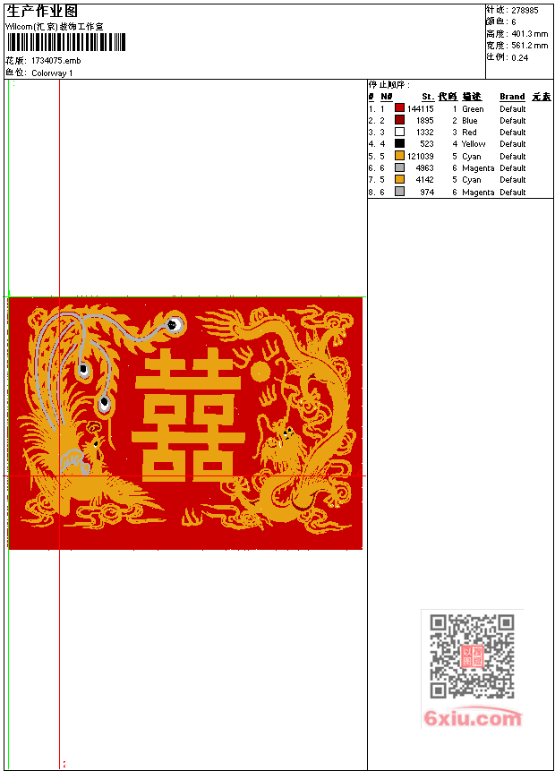龙凤喜缘乱针绣工艺精品 点此上传花版兑乐绣币/现金 emb花版参数: 大小:1.18 MB / 尺寸:561*401[毫米] / 针数:278985针 / 线色:6 / 格式:emb / 版本:7 版带文件需绣花软件方可打开,可配色打印导出各种格式或直接上机绣。如无绣花软件可下载1:1模拟效果图。 PNG图片信息:大小:7.8 (MB) /图宽*高:2123x1518(像素) 上传作者( 雷人*** ) 获得乐绣币:30个 emb下载 1:1图下载 关闭 相似花型推荐: 龙凤吉祥工艺精品 龙风呈祥工艺精品 鲤鱼工艺精品 人物 雷锋工艺精品 老鹰工艺精品 孔雀开屏工艺精品 人物 敬爱的周总理乱针绣工艺精品 鸟 靓花 锦绣前程工艺精品 鸡鸣发财工艺精品 树 黄金大道乱针绣工艺精品 花开富贵工艺精品 牡丹花 鸟 花好月圆工艺精品 花工艺精品 虎-老虎工艺精品 牡丹花 国色天香工艺精品 上一个花样:龙吐珠工艺精品 下一个花样:龙凤吉祥工艺精品