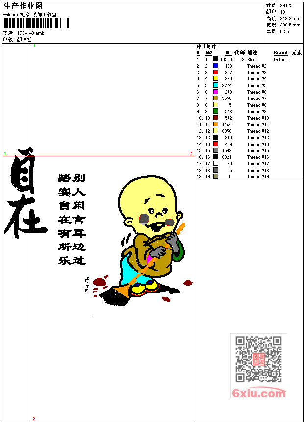 人物 和尚 字 自在工艺精品 点此上传花版兑乐绣币/现金 emb花版参数: 大小:142.50 KB / 尺寸:237*213[毫米] / 针数:39125针 / 线色:19 / 格式:emb / 版本:9 版带文件需绣花软件方可打开,可配色打印导出各种格式或直接上机绣。如无绣花软件可下载1:1模拟效果图。 PNG图片信息:大小:0.5 (MB) /图宽*高:895x805(像素) 上传作者( 雷人*** ) 获得乐绣币:30个 emb下载 1:1图下载 关闭 相似花型推荐: 竹石图工艺精品 人物 神 钟汉离工艺精品 字 知足常乐之忍毛巾绣工艺精品 鱼 鲤鱼 月月有余工艺精品 郁金香乱针绣工艺精品 美女 玉女吹箫工艺精品 鱼乱针绣工艺精品 松 迎客松工艺精品 字画 毅力工艺精品 鸟 依偎工艺精品 马车 一马当先一路平安工艺精品 牡丹花 工艺精品 字 人物 笑工艺精品 鸟与花卉工艺精品 鹤 仙鹤工艺精品 上一个花样:美女 嫦娥奔月图工艺精品 下一个花样:竹石图工艺精品