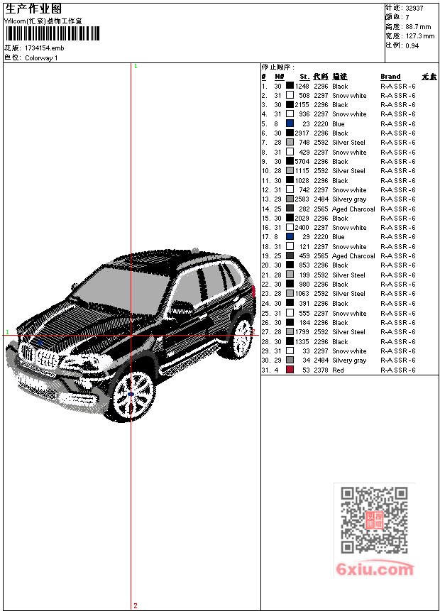 车 宝马X5工艺精品 点此上传花版兑乐绣币/现金 emb花版参数: 大小:173.50 KB / 尺寸:127*89[毫米] / 针数:32939针 / 线色:7 / 格式:emb / 版本:9 版带文件需绣花软件方可打开,可配色打印导出各种格式或直接上机绣。如无绣花软件可下载1:1模拟效果图。 PNG图片信息:大小:0.3 (MB) /图宽*高:482x336(像素) 上传作者( 雷人*** ) 获得乐绣币:30个 emb下载 1:1图下载 关闭 相似花型推荐: 荷花 鸳鸯 百年好合工艺精品 鹤 百鹤图工艺精品 人物 白居易工艺精品 字 人物 把握人生工艺精品 字 爱拼才会赢工艺精品 龍工艺精品 龙 美人蛇 蟒蛇工艺精品 鸟 鹦鹉工艺精品 花朵 缂丝花工艺精品 美女 嫦娥奔月图工艺精品 人物 和尚 字 自在工艺精品 竹石图工艺精品 人物 神 钟汉离工艺精品 字 知足常乐之忍毛巾绣工艺精品 鱼 鲤鱼 月月有余工艺精品 上一个花样:虎 奔跑的老虎工艺精品 下一个花样:荷花 鸳鸯 百年好合工艺精品