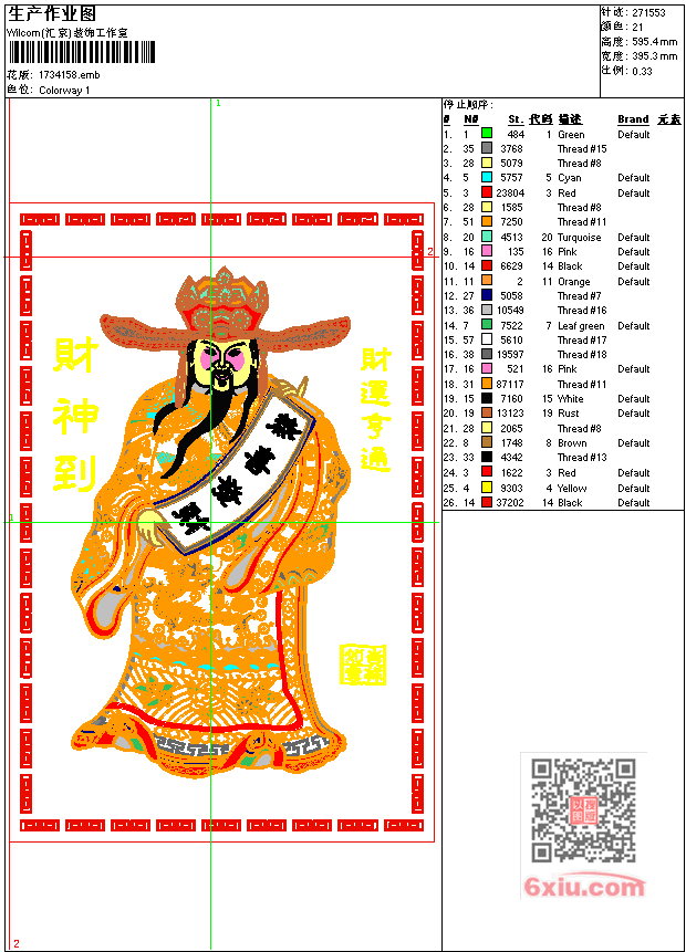 人物 财神到-财运亨通工艺精品 点此上传花版兑乐绣币/现金 emb花版参数: 大小:715.00 KB / 尺寸:395*595[毫米] / 针数:271553针 / 线色:21 / 格式:emb / 版本:9 版带文件需绣花软件方可打开,可配色打印导出各种格式或直接上机绣。如无绣花软件可下载1:1模拟效果图。 PNG图片信息:大小:3.1 (MB) /图宽*高:1496x2253(像素) 上传作者( 雷人*** ) 获得乐绣币:30个 emb下载 1:1图下载 关闭 相似花型推荐: 人物 布袋佛工艺精品 鸟 比翼鸟工艺精品 虎 奔跑的老虎工艺精品 车 宝马X5工艺精品 荷花 鸳鸯 百年好合工艺精品 鹤 百鹤图工艺精品 人物 白居易工艺精品 字 人物 把握人生工艺精品 字 爱拼才会赢工艺精品 龍工艺精品 龙 美人蛇 蟒蛇工艺精品 鸟 鹦鹉工艺精品 花朵 缂丝花工艺精品 美女 嫦娥奔月图工艺精品 人物 和尚 字 自在工艺精品 上一个花样:人物 成龙-乱针绣工艺精品 下一个花样:人物 布袋佛工艺精品
