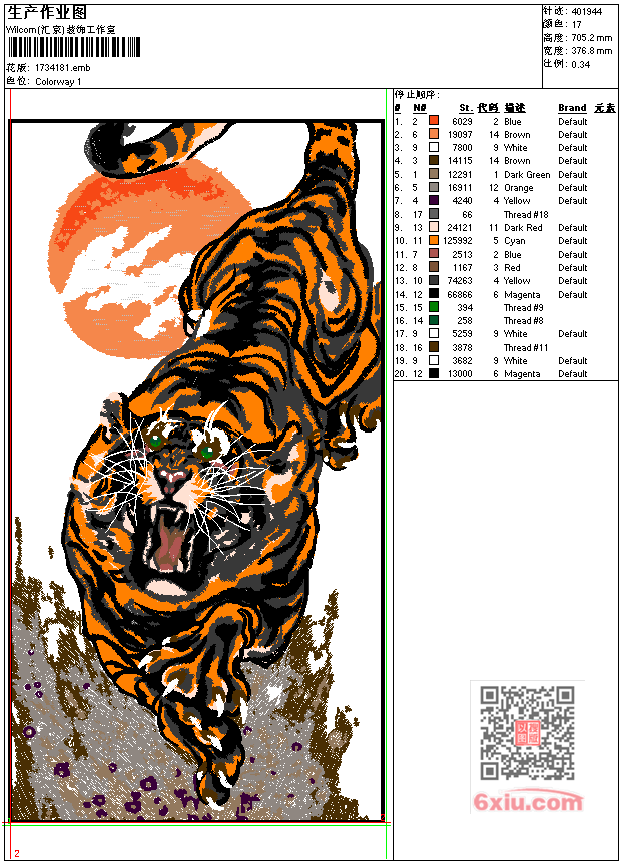 虎啸图工艺精品 点此上传花版兑乐绣币/现金 emb花版参数: 大小:1.68 MB / 尺寸:377*705[毫米] / 针数:401944针 / 线色:17 / 格式:emb / 版本:7 版带文件需绣花软件方可打开,可配色打印导出各种格式或直接上机绣。如无绣花软件可下载1:1模拟效果图。 PNG图片信息:大小:6.6 (MB) /图宽*高:1426x2668(像素) 上传作者( 雷人*** ) 获得乐绣币:30个 emb下载 1:1图下载 关闭 相似花型推荐: 虎头-乱针绣工艺精品 虎工艺精品 树 黄金满地 红枫满绣工艺精品 鹤与竹工艺精品 人物 神 如来 观音普照工艺精品 人物 古代美女踏雪图工艺精品 花朵 贡菊工艺精品 字 大吉大利 恭喜发财工艺精品 孔雀 富贵祯祥工艺精品 孔雀 工艺精品 风景-草原 乱针绣工艺精品 鸟 冬腊梅工艺精品 鹰 大展宏图工艺精品 龙 花瓶 大龙瓶-苏绣乱针绣工艺精品 景 中堂画 唐伯虎 春游图工艺精品 上一个花样:鸟 湖 芦苇深处苇海精灵工艺精品 下一个花样:虎头-乱针绣工艺精品