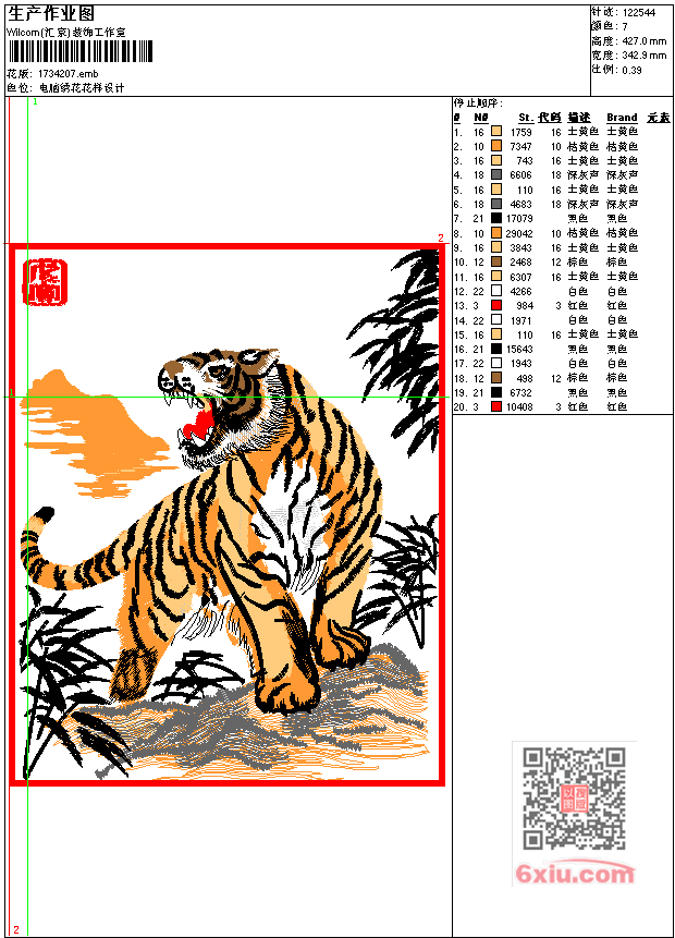 十二生肖之虎工艺精品 点此上传花版兑乐绣币/现金 emb花版参数: 大小:241.00 KB / 尺寸:343*427[毫米] / 针数:122544针 / 线色:7 / 格式:emb / 版本:9 版带文件需绣花软件方可打开,可配色打印导出各种格式或直接上机绣。如无绣花软件可下载1:1模拟效果图。 PNG图片信息:大小:2.7 (MB) /图宽*高:1297x1616(像素) 上传作者( 雷人*** ) 获得乐绣币:30个 emb下载 1:1图下载 关闭 相似花型推荐: 猴 十二生肖之猴工艺精品 熊猫 竹 十宝图工艺精品 景 中堂 山水画工艺精品 鸟 山雀山茶花图工艺精品 鹤 三屏鹤工艺精品 牡丹花 荣华工艺精品 字画 忍工艺精品 秋果-乱针绣工艺精品 龙 排骨龙 字 宁静致远工艺精品 鱼 鲤鱼 年年有余工艺精品 牡丹花工艺精品 插针 牡丹工艺精品 名画-裸女泉-乱针绣工艺精品 梅竹工艺精品 上一个花样:字画 人物 时也运也工艺精品 下一个花样:猴 十二生肖之猴工艺精品