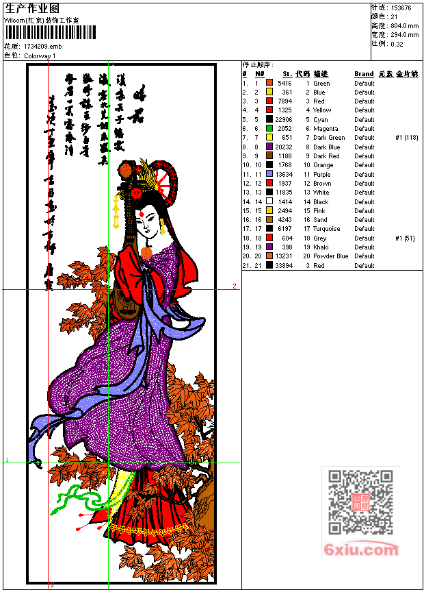 人物 四大美女-昭君工艺精品 点此上传花版兑乐绣币/现金 emb花版参数: 大小:802.50 KB / 尺寸:294*804[毫米] / 针数:153676针 / 线色:21 / 格式:emb / 版本:9 版带文件需绣花软件方可打开,可配色打印导出各种格式或直接上机绣。如无绣花软件可下载1:1模拟效果图。 PNG图片信息:大小:3.7 (MB) /图宽*高:1113x3042(像素) 上传作者( 雷人*** ) 获得乐绣币:30个 emb下载 1:1图下载 关闭 相似花型推荐: 字画 人物 时也运也工艺精品 十二生肖之虎工艺精品 猴 十二生肖之猴工艺精品 熊猫 竹 十宝图工艺精品 景 中堂 山水画工艺精品 鸟 山雀山茶花图工艺精品 鹤 三屏鹤工艺精品 牡丹花 荣华工艺精品 字画 忍工艺精品 秋果-乱针绣工艺精品 龙 排骨龙 字 宁静致远工艺精品 鱼 鲤鱼 年年有余工艺精品 牡丹花工艺精品 插针 牡丹工艺精品 上一个花样:龙 四神兽之青龙工艺精品 下一个花样:字画 人物 时也运也工艺精品