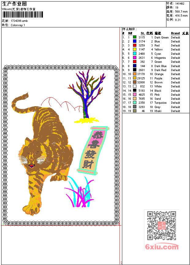 虎 新版猛虎下山工艺精品 点此上传花版兑乐绣币/现金 emb花版参数: 大小:587.00 KB / 尺寸:417*569[毫米] / 针数:141482针 / 线色:19 / 格式:emb / 版本:7 版带文件需绣花软件方可打开,可配色打印导出各种格式或直接上机绣。如无绣花软件可下载1:1模拟效果图。 PNG图片信息:大小:2.4 (MB) /图宽*高:1576x2152(像素) 上传作者( 雷人*** ) 获得乐绣币:30个 emb下载 1:1图下载 关闭 相似花型推荐: 人物 童子 小财神麒麟图工艺精品 龙凤 相敬如宾工艺精品 风景 乡村风光工艺精品 松 仙鹤工艺精品 梅花 鸟 喜上梅梢工艺精品 美女 人物 西施工艺精品 童子 传统 五子送福图工艺精品 字画 文字书法 工艺精品 卡通 天长地久工艺精品 风景 阁楼 塔工艺精品 松鹤朝阳工艺精品 老虎 四神兽 之 白虎 传统工艺精品 龙 双龙戏珠工艺精品 老虎乌龟富贵图工艺精品 梅花 报春图工艺精品 上一个花样:特种绣 抱枕鸟工艺精品 下一个花样:人物 童子 小财神麒麟图工艺精品