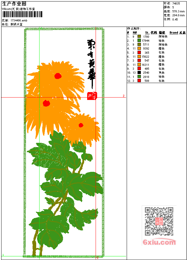 春夏秋冬-菊花工艺精品 点此上传花版兑乐绣币/现金 emb花版参数: 大小:261.50 KB / 尺寸:204*578[毫米] / 针数:74035针 / 线色:5 / 格式:emb / 版本:7 版带文件需绣花软件方可打开,可配色打印导出各种格式或直接上机绣。如无绣花软件可下载1:1模拟效果图。 PNG图片信息:大小:2.1 (MB) /图宽*高:772x2188(像素) 上传作者( 雷人*** ) 获得乐绣币:30个 emb下载 1:1图下载 关闭 相似花型推荐: 字画 百福图工艺精品 马 八骏奔腾工艺精品 人物 头像 美女 奥黛丽赫工艺精品 人物 特种绣 爱心天使工艺精品 吉祥 大吉 装饰 工艺精品 特种绣 抱枕鸟工艺精品 虎 新版猛虎下山工艺精品 人物 童子 小财神麒麟图工艺精品 龙凤 相敬如宾工艺精品 风景 乡村风光工艺精品 松 仙鹤工艺精品 梅花 鸟 喜上梅梢工艺精品 美女 人物 西施工艺精品 童子 传统 五子送福图工艺精品 字画 文字书法 工艺精品 上一个花样:鹰 对联 中堂 大展鸿图工艺精品 下一个花样:字画 百福图工艺精品