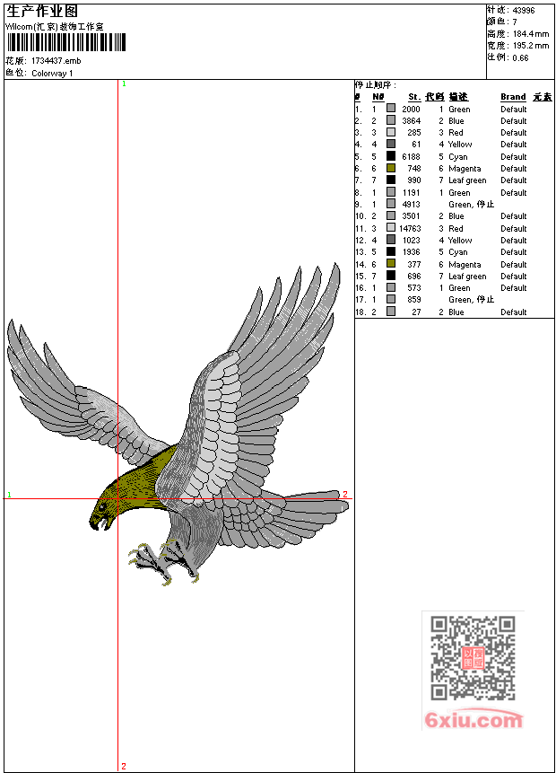 鹰 大展鸿图雄鹰展翅工艺精品 点此上传花版兑乐绣币/现金 emb花版参数: 大小:228.00 KB / 尺寸:195*184[毫米] / 针数:43996针 / 线色:7 / 格式:emb / 版本:7 版带文件需绣花软件方可打开,可配色打印导出各种格式或直接上机绣。如无绣花软件可下载1:1模拟效果图。 PNG图片信息:大小:0.5 (MB) /图宽*高:739x698(像素) 上传作者( 雷人*** ) 获得乐绣币:30个 emb下载 1:1图下载 关闭 相似花型推荐: 人物 小龙女刘亦菲工艺精品 家和万事兴十字绣工艺精品 牡丹花大红花 工艺精品 红玫瑰花十字绣工艺精品 字画唐诗古诗工艺精品 头像 脸谱 长命百岁工艺精品 风景 船 一帆风顺工艺精品 凤凰 心心相印工艺精品 人物 关羽 协天上帝-关公工艺精品 鸟 喜雀报春 大红花 牡丹花 工艺精品 鱼 吉祥 九鲤图工艺精品 牡丹花 华堂春暖工艺精品 牡丹花-富贵满堂 工艺精品 鹰 大展宏图工艺精品 梅花 鸟 喜鹊登梅工艺精品 上一个花样:鸟 燕子工艺精品 下一个花样:人物 小龙女刘亦菲工艺精品