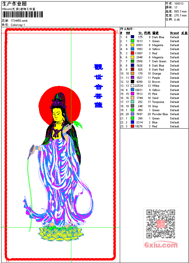 人物 观音大士工艺精品 点此上传花版兑乐绣币/现金 emb花版参数: 大小:370.50 KB / 尺寸:271*566[毫米] / 针数:109313针 / 线色:17 / 格式:emb / 版本:e1.5 版带文件需绣花软件方可打开,可配色打印导出各种格式或直接上机绣。如无绣花软件可下载1:1模拟效果图。 PNG图片信息:大小:1.6 (MB) /图宽*高:1024x2140(像素) 上传作者( 雷人*** ) 获得乐绣币:30个 emb下载 1:1图下载 关闭 相似花型推荐: 人物 观音工艺精品 鹤 龙 古代 官服 工艺精品 竹工艺精品 字画诗 书法 百忍成金工艺精品 福如东海工艺精品字画 龙凤 爱情工艺精品 龙凤工艺精品 花瓶水仙花工艺精品 招财进宝工艺精品传统字 人物账神到工艺精品 船-吉祥如意-工艺精品 鸟 燕子工艺精品 鹰 大展鸿图雄鹰展翅工艺精品 人物 小龙女刘亦菲工艺精品 家和万事兴十字绣工艺精品 上一个花样:孔雀工艺精品 下一个花样:人物 观音工艺精品