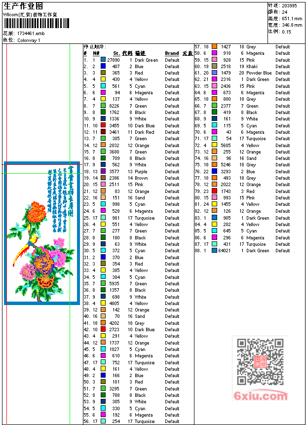 牡丹花 鸟 富贵吉祥长寿图工艺精品 点此上传花版兑乐绣币/现金 emb花版参数: 大小:929.50 KB / 尺寸:347*651[毫米] / 针数:203995针 / 线色:24 / 格式:emb / 版本:7 版带文件需绣花软件方可打开,可配色打印导出各种格式或直接上机绣。如无绣花软件可下载1:1模拟效果图。 PNG图片信息:大小:3.1 (MB) /图宽*高:1312x2463(像素) 上传作者( 雷人*** ) 获得乐绣币:30个 emb下载 1:1图下载 关闭 相似花型推荐: 人物 财神爷 工艺精品 狼-雪狼工艺精品-动物 鸟 抱枕 工艺精品 喜 米奇 百年好合-婚庆工艺精品 寿字-八仙庆寿工艺精品 水果 松鼠工艺精品 船 迎风破浪工艺精品 鹰-老鹰工艺精品-鸟 字画诗 书法 兰亭序工艺精品 孔雀工艺精品 人物 观音大士工艺精品 人物 观音工艺精品 鹤 龙 古代 官服 工艺精品 竹工艺精品 字画诗 书法 百忍成金工艺精品 上一个花样:竹寒梅工艺精品 下一个花样:人物 财神爷 工艺精品