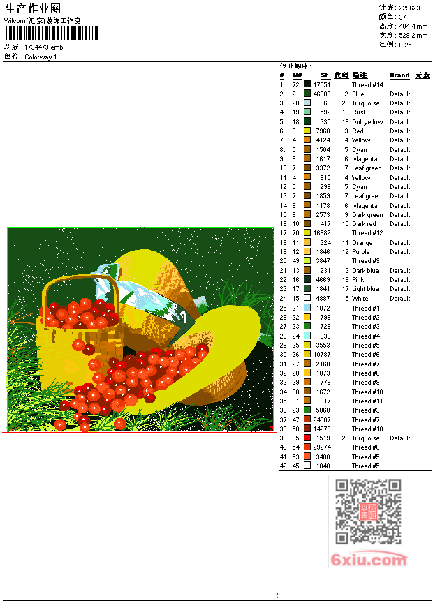 水果 草帽工艺精品 点此上传花版兑乐绣币/现金 emb花版参数: 大小:1.11 MB / 尺寸:529*404[毫米] / 针数:229623针 / 线色:37 / 格式:emb / 版本:7 版带文件需绣花软件方可打开,可配色打印导出各种格式或直接上机绣。如无绣花软件可下载1:1模拟效果图。 PNG图片信息:大小:6.8 (MB) /图宽*高:2002x1530(像素) 上传作者( 雷人*** ) 获得乐绣币:30个 emb下载 1:1图下载 关闭 相似花型推荐: 风景 乱针绣 园林工艺精品 风景芦苇工艺精品 龙凤呈祥工艺精品 船 一帆风顺工艺精品 人物 送子观音工艺精品 风景 船 水乡工艺精品 人物 传统 雷神 工艺精品 鸟 镜心花鸟工艺精品 大红花工艺精品 鹤工艺精品 竹寒梅工艺精品 牡丹花 鸟 富贵吉祥长寿图工艺精品 人物 财神爷 工艺精品 狼-雪狼工艺精品-动物 鸟 抱枕 工艺精品 上一个花样:风景 山水画 工艺精品 下一个花样:风景 乱针绣 园林工艺精品