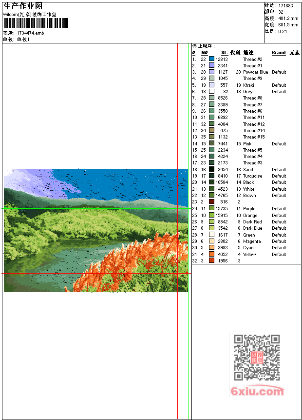 风景 山水画 工艺精品 点此上传花版兑乐绣币/现金 emb花版参数: 大小:3.67 MB / 尺寸:602*401[毫米] / 针数:171883针 / 线色:32 / 格式:emb / 版本:7 版带文件需绣花软件方可打开,可配色打印导出各种格式或直接上机绣。如无绣花软件可下载1:1模拟效果图。 PNG图片信息:大小:8.0 (MB) /图宽*高:2276x1518(像素) 上传作者( 雷人*** ) 获得乐绣币:30个 emb下载 1:1图下载 关闭 相似花型推荐: 水果 草帽工艺精品 风景 乱针绣 园林工艺精品 风景芦苇工艺精品 龙凤呈祥工艺精品 船 一帆风顺工艺精品 人物 送子观音工艺精品 风景 船 水乡工艺精品 人物 传统 雷神 工艺精品 鸟 镜心花鸟工艺精品 大红花工艺精品 鹤工艺精品 竹寒梅工艺精品 牡丹花 鸟 富贵吉祥长寿图工艺精品 人物 财神爷 工艺精品 狼-雪狼工艺精品-动物 上一个花样:风景 红枫林工艺精品 下一个花样:水果 草帽工艺精品