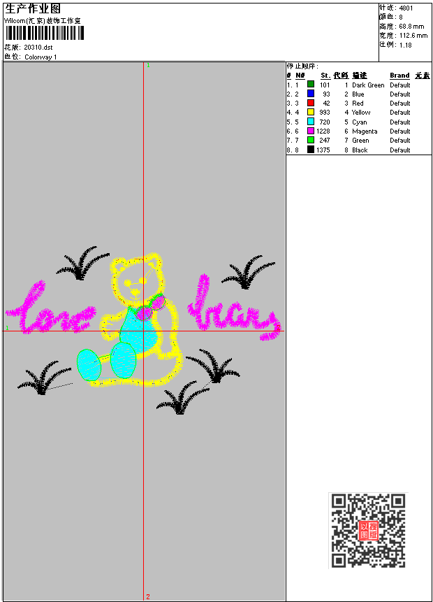 熊的图案 点此上传花版兑乐绣币/现金 dst花版参数: 大小:14.57 KB / 尺寸:113*69[毫米] / 针数:4801针 / 线色:8 / 格式:dst / 版本:6 版带文件需绣花软件方可打开,可配色打印导出各种格式或直接上机绣。如无绣花软件可下载1:1模拟效果图。 PNG图片信息:大小:0.1(MB) /图宽*高:426x261(像素) 上传作者( 天下*** ) 获得乐绣币:0个 dst下载 1:1图下载 关闭 相似花型推荐: 童装字母图案 童装字母图案 字母数字图案 荷花刺绣图案_荷花图案_电脑荷花图案 窗帘花_裤脚花_下摆花_刺绣版带_电脑版 下摆_裤裙窗帘图案 几何图形_窗帘图案 简单小花_窗帘家纺图案 抽像窗帘图案 窗帘图案 玫瑰花_花蕾_花蕊刺绣图 长花图案 妖艳的下摆图案 简单的衣领图案 裤脚图案 上一个花样:猴子卡通图案 下一个花样:童装字母图案