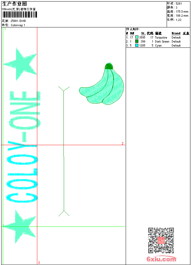 水果图案 点此上传花版兑乐绣币/现金 emb花版参数: 大小:188.00 KB / 尺寸:108*176[毫米] / 针数:5281针 / 线色:3 / 格式:emb / 版本:8 版带文件需绣花软件方可打开,可配色打印导出各种格式或直接上机绣。如无绣花软件可下载1:1模拟效果图。 PNG图片信息:大小:0.1 (MB) /图宽*高:410x664(像素) 上传作者( wopn*** ) 获得乐绣币:0个 emb下载 1:1图下载 关闭 相似花型推荐: 王羲之咏鹅 仿手绣_电脑图案 心型花 花季少女_卡通贴布图案 螺旋花蕊 国宝大熊猫_图案_EMB格式 sky_衣领版带 珠片灯笼花_亮片图案下载 唐装龙_吉祥图案 人物 弥勒佛_精品工艺版 鲲鹏展翅 鹰 大展宠图 美女人物 背影精品十字绣 小狗贴布绣_EMB格式 樱桃图案 树叶图案_emb格式 上一个花样:PD-5064a_盘带图案_特种图案 下一个花样:王羲之咏鹅