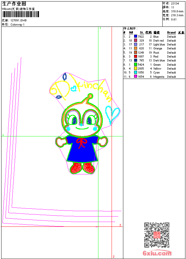可爱的小娃娃_童装图案 点此上传花版兑乐绣币/现金 emb花版参数: 大小:93.00 KB / 尺寸:218*310[毫米] / 针数:23134针 / 线色:11 / 格式:emb / 版本:7 版带文件需绣花软件方可打开,可配色打印导出各种格式或直接上机绣。如无绣花软件可下载1:1模拟效果图。 PNG图片信息:大小:0.3 (MB) /图宽*高:826x1173(像素) 上传作者( 王洪*** ) 获得乐绣币:15个 emb下载 1:1图下载 关闭 相似花型推荐: 童装卡通刺绣版带 童装卡通版带图案 章仔标志图案 可爱的小姑娘图案 LOGO章仔刺绣图案 章仔图案 小狗章仔_LOGO字母图案 章仔卡通小白兔图案 章仔_小猫图案 前幅花 前胸花_女装图案 龙的图案 消防车_贴布绣 牡丹图案 腰花_花卉刺绣图案 上一个花样:章仔卡通刺绣图案 下一个花样:童装卡通刺绣版带