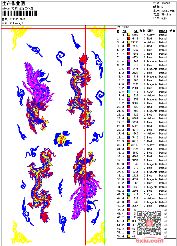 - emb花版参数: 大小:966.00 KB / 尺寸:598*1351[毫米] / 针数:318008针 / 线色:5 / 格式:emb / 版本:2006
